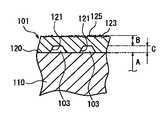또한, 이 폐공간(103)은 상면이 저면보다 좁게 형성되어 있으며, 보다 구체적으로는, 폐공간(103)은 저면이 상면보다 폭이 좁은 단면이 대략 사다리 형상으로 형성되어 있다.  또, 도시한 예에서는 폐공간(103)의 단면은, 그 기울어진 변이 서로 다른 방향으로 대략 동일한 각도로 경사진 사다리 형상으로 형성되어 있다.  또, 본 실시 형태의 폐공간(103)의 형상은, 평면에서 보았을 때 원 형상(상면 및 저면이 원형)으로 형성되어 있다(도 3참조).  또, 본원 발명에서 폐공간(103)(오목부(121))의 형상은, 다양한 형상의 것을 채용 가능하다.  또한, 본 실시 형태와 같이 폐공간(103)(오목부(121))의 단면을 사다리 형상으로 형성하는 경우라도, 다양한 형상의 것을 채용 가능하다.  즉, 도 4a에 도시한 바와 같이 평면에서 보았을 때 직선 부분과 원호 부분을 갖는 형상이나, 도 4b에 도시한 바와 같이 평면에서 보았을 때 타원 형상이나, 도 4c에 도시한 바와 같이 평면에서 보았을 때 만곡선을 갖는 형상이나, 도 4d에 도시한 바와 같이 평면에서 보았을 때 사각형상의 것을 채용할 수도 있다.In addition, the