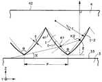 또한, 지향성 광 출사 기능부가 부여되어 있지 않은 다른 주면에는, 도광체(3)로부터의 출사광의 광원(1)과 평행한 면(YZ면)에서의 지향성을 제어하기 위해서, 광 입사면(31)에 대하여 대략 수직 방향(X 방향)으로 연장되는 다수의 렌즈열을 배열한 렌즈면을 형성하는 것이 바람직하다.  도 1에 도시한 실시 형태에  있어서는, 광 출사면(33)에 거친면을 형성하고, 이면(34)에 광 입사면(31)에 대하여 대략 수직 방향(X 방향)으로 연장되는 다수의 렌즈열의 배열로 이루어지는 렌즈면을 형성하고 있다.  본 발명에 있어서는, 도 1에 도시한 형태와는 반대로, 광 출사면(33)에 렌즈면을 형성하고, 이면(34)을 거친면으로 할 수도 있다.Moreover, in order to control the directivity in the surface (YZ plane) parallel to the