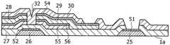전술한 바와 같이, 소스/드레인 배선으로서의 통상의 배선은 각각 알루미늄 합금 박막상에 및 알루미늄 합금 박막의 아래에 배치된 알루미늄 합금 박막 및 장벽 금속층(54 및 53)을 포함한다.  이러한 배선의 대표적인 예로는 두께가 약 50㎚인 몰리브덴(Mo)층 (하부 장벽 금속층), 두께가 약 150㎚인 순수한 알루미늄 또는 Al-Nd 합금 박막, 및 두께가 약 50㎚인 Mo층(상부 장벽 금속층)의 순서로 배치된 것을 포함하는 다층 (3층) 배선이다.  하부 장벽 금속층은 알루미늄 합금 박막과 무정형 규소 박막 사이의 계면에서 규소와 알루미늄의 사이에서의 상호확산을 방지하도록 주로 배치된다.  상부 장벽 금속층은 알루미늄 합금 박막의 표면상에서의 힐록(hillock) (혹 모양 돌기물)이 방지되도록 주로 배치된다.  이러한 메카니즘은 하기에서 상세하게 설명될 것이다.As mentioned above, conventional wiring as source / drain wiring includes aluminum alloy thin films and