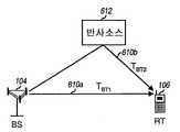 도 6a 는 중계기가 사용되지 않게 되는 기지국 (104) 로부터 원격 터미널 (106) 로의 송신의 도면이다. 도 6a 에 나타낸 바와 같이, 기지국 (104) 으로부터의 신호는 직접 가시선 경로 (610a) 또는 반사 소스 (612) 로부터 튀어나온 후의 반사된 경로 (612b) 를 통하여 원격 터미널 (106) 에 도달할 수 있다. 각각의 송신 경로는 해당 전파 경로와 연관된다 (예를들어, 도 6a 에 나타낸 바와 같은, TBT1 및 TBT2).6A is a diagram of transmission from