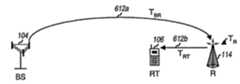 도 6b 는 기지국 (104) 으로부터 원격 터미널 (106) 로의 중계기 (114) 를 통한 송신의 도면이다. 이 실시예에서, 원격 터미널 (106) 은 중계기 (114) 의 커버리지에 있으며, 장애나 일부 다른 이유 때문에, 기지국 (104) 으로부터의 직접 송신을 수신할 수 없다 (기지국 (104) 로부터 수신한 송신은 약할 수 있음). 도 6B 에 나타낸 바와 같이, 신호는 먼저 기지국 (104) 로부터 중계기 (114) 로 무선 또는 유선 링크 (612a) 를 통하여 송신되며, 중계기 (114) 에 의해서 컨디셔닝되고, 원격 터미널 (106) 로 송신된다. 중계기 (114) 내의 추가적인 지연 TR 은 신호의 전체 전파 지연을 증가시킨다. 또한, 중계기가 원격 터미널로부터 보다 기지국으로부터 더 멀리 위치하는 경우 (도 6b 에 나타낸 바와 같이), 도 6b 에 나타낸 바와 같이, 신호는 중계기로의 그리고 다시 원격 터미널로의 보다 긴 거리로 인하여 보다 긴 전파 지연을 겪게 된다.6B is a diagram of transmission via