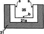 두 번째, 도 10b에서, 클래딩(21a)의 일부가 등방성 프로세스를 이용해 트렌치(33)에 증착된다(그러므로 트렌치(33)의 측벽이 트렌치(33)의 바닥 b와 거의 동일한 두께로 입혀진다).  클래딩(21a)에 이용되는 물질은 자기적으로 연성인 물질, 즉, 자기 코어로 작용하기에 충분할 정도로 투과성이고, 어떠한 틈(breaks)이나 너무 많은 보이드(voids)없이 단면적 전반에 걸쳐 연속적이다.  트렌치(35)는 클래딩(21a)의 등방성 증착의 결과로 형성된다.Second, in FIG. 10B, a portion of the