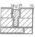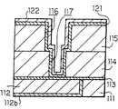 도 7a에 도시하는 바와 같이, 기판(예를 들면 반도체 기판)(91)(도시 생략) 상에 형성된 제 1 절연막(111)에 예를 들면 홈 배선 구조의 제 1 배선(112)이 배리어층(112b)을 통해 형성되어 있다.  상기 제 1 절연막(111) 상에는 제 1 배선(112)을 피복하는 확산 방지층(113)이 형성되며, 그 위에 제 2 절연막(114)이 형성되어 있다.  상기 확산 방지층(113)은 접속 구멍 형성 시의 에칭 스토퍼로서의 기능을 갖고 있어도 된다.  더욱이 제 2 절연막(114) 상에는 제 3 절연막(115)이 형성되어 있다.  제 3 절연막(115)에는 오목부(116)(이하 홈(116)으로 하여 설명한다)가 형성되며, 그 홈(116)의 바닥부로부터 제 2 절연막(114)을 관통하여 제 1 배선(112)에 이르는 접속 구멍(117)이 형성되어 있다.As shown in FIG. 7A, the