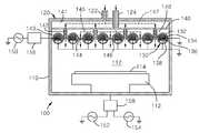 구체적으로, 가스 공급부(120)는 제1 및 제2 가스 주입구(122, 124)와 가스 공급 분리판(140)을 구비한다.  가스 공급 분리판(140)은 가스 공급부(120)를 상부 공간(141)과 하부 공간(148)으로 분할하여 제1 및 제2 가스 공급 경로(147, 145)를 형성할 수 있도록 한다.  제1 가스 주입구(122)는 상부 공간(141)에 연결되고, 제2 가스 주입구(124)는 하부 공간(148)에 연결된다.  복수개의 선형 플라즈마 발생 유닛(130)의 사이에는 진공챔버(110)의 내부 공간(112)에 접하는 가스 분사판(146)이 구성된다.  가스 분사판(146)에는 복수개의 선형 플라즈마 발생 유닛(130)의 사이를 따라서 형성되는 복수개의 가스 분사구(144)가 형성된다.  복수개의 가스 분사구(144)들 중 일부는 상부 공간(141)은 다수개의 연결관(142)에 의해 연결되어 복수개의 선형 플라즈마 발생 유닛(130)의 사이를 따라서 교대적으로 서로 다른 두 개의 공정 가스가 분리 공급된다.  이와 같이 서로 다른 공정 가스를 분리 공급하도록 하여 플라즈마 처리의 균일도를 높일 수 있다.In detail, the