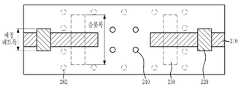중간 비아(240)는 제1 유전체기판(250)을 관통하여 제1 접지면(251)과 직각 으로 연결하고, 다수의 비아(via)를 소정의 패턴으로 배열한다. 즉, 중간 비아(240)는 전송선(210) 선로의 종단에 직교하는 방향으로 형성한다.The intermediate via 240 penetrates the first
