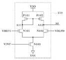 본 실시예에서, 상기 기준전압 발생부는 내부전압 공급단과 제 1 노드 간에 직렬로 설치되는 제 1 MOS 다이오드와 제 1 저항과; 상기 제 1 노드와 제 2 노드 간에 설치되는 제 2 저항과; 상기 제 2 노드와 접지단 간에 직렬로 설치되는 제 2 MOS 다이오드를 포함하여 구성되고, 상기 제 1 기준전압은 상기 제 1 노드의 출력전압이고, 상기 제 2 기준전압은 상기 제 2 노드의 출력전압인 것이 바람직하다.In the present embodiment, the reference voltage generator includes: a first MOS diode and a first resistor disposed in series between an internal voltage supply terminal and a first node; A second resistor disposed between the first node and the second node; And a second MOS diode disposed in series between the second node and the ground terminal, wherein the first reference voltage is an output voltage of the first node, and the second reference voltage is an output voltage of the second node. Is preferably.