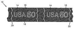 이러한 일 양태에서, 금속제 이미지는 금속 선 및 비-금속 선이 교대로 존재하는 하나 또는 그 이상의 무늬 형태를 가진 음각 또는 역상 캐릭터(예, 기호, 문자 및/또는 숫자)를 포함한다. 이러한 양태에서, 전술한 비-금속 선의 갯수 범위 중 하한 한계 미만에 속하는 비-금속 선의 갯수(즉, <0.07mm)는 특징 또는 텍스트 영역이 금속 잉크에 의해 초래되는 변조와 유사한 회색빛을 나타내게 하는 반면, 전술한 갯수 범위 중 상한 한계를 초과하는 비-금속 선의 갯수(즉, >0.25mm)는 그 캐릭터나 텍스트 영역이 통상의 음각 텍스트(미국 특허 4,943,093(Melling et al.)에 도시되고 설명된 바와 같은)처럼 나타나게 하여 금속 잉크 및 금속박 전사를 통한 복제가 쉬운 것이다.In one such aspect, the metal image comprises an engraved or reversed phase character (eg, symbols, letters and / or numbers) having one or more patterned forms of alternating metal and non-metallic lines. In this embodiment, the number of non-metal lines (ie, <0.07 mm) that falls below the lower limit of the above-described number of non-metal lines may cause the feature or text area to exhibit gray color similar to the modulation caused by the metal ink. On the other hand, the number of non-metallic lines (i.e.,> 0.25 mm) exceeding the upper limit of the above-mentioned number range indicates that the character or text area is shown and described in conventional engraving text (US Patent 4,943,093 (Melling et al.). To facilitate copying through metal ink and metal foil transfer.