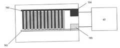인터디지테이티드 어레이(interdigitated array) 전극(702,703)에 의해 구현된 임피던스 측정장치의 일 실시예를 보인다. 인터디지테이티드 어레이(interdigitated array) 전극(702,703)의 디지트(digit) 개수를 증가시킬수록 탐지기의 감도는 증가한다.One embodiment of an impedance measuring device implemented by interdigitated