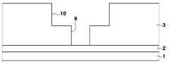 그 다음, 도 3c에 도시한 바와 같이, 제1 반사 방지막(5) 및 제1감광막(6)을 제거하고 제2 반사 방지막(7) 및 제2 감광막(8)을 순차적으로 형성한 다음, 제2 식각 정지막(4)의 상부 표면이 드러나도록 식각한다.  이것은 금속 배선이 형성되는 트렌치(10)를 형성하기 위한 것이다.Next, as shown in FIG. 3C, the