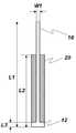 도 2 는 본 실시형태에 따른 이중 대역 안테나의 정면도이다.  제 1 방사체 (10) 는 실질적으로 띠 형태로 연장하며, 길이 L1 을 갖는다.  제 2 방사체 (20) 역시 실질적으로 띠 형태로 연장하며, 길이 L2 를 갖는다.  L1 과 L2 는 안테나를  동작시키고자 하는 주파수에 따라 자유롭게 정해질 수 있으나, 본 실시형태에서는 L1 이 L2 보다 큰 것이 바람직하다.  제 1 방사체 (10) 가 직접 급전되어 실질적으로 모노폴 안테나로 동작하므로, 체배 주파수에서의 공진도 발생시킨다.  따라서, L1 을 L2 보다 크게 함으로써, 제 1 방사체 (10) 에 의한 제 1 공진 주파수, 제 2 방사체 (20) 에 의한 제 2 공진 주파수, 및 제 1 공진 주파수의 체배 주파수인 제 3 공진 주파수가 이 크기 순서로 얻어질 수 있으며 다중 대역을 구현할 수 있다.  또한 제 1 공진 주파수와 제 2 공진 주파수의 차이를 작게 함으로써 2 개의 공진 주파수에 의한 광대역 특성을 얻을 수도 있다.2 is a front view of the dual band antenna according to the present embodiment. The