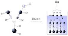 도 5에는 나노금 입자 (nanogold particle) 또는 라텍스 비드 (lataex bead)에 결합된 항체를 사용하여 면역 반응에 의한 전기화학적 신호발생을 유도하는 개략적인 방법이 도시되어 있다.  도 5를 참조하면, 분석물 채취부로부터 유입된 검체 항원 (51) 및 표준 항원 (52)의 혼합물은, 각각 항체 (53)에 대한 결합 부위 (54 및 54')를 포함하고 있으므로, 나노금 입자 또는 라텍스 비드 (56)에 결합된 항체 (53)에 경쟁적으로 결합하게 된다.  이어서, 상기 검체 항원 (51)과 항체 (53)의 면역반응물 및 상기 표준 항원 (52)과 항체 (53)의 면역반응물의 혼합물에 대해서 원심분리를 수행하면 항체 (53)와 결합된 검체 항원 (51) 또는 표준 항원 (52)은 나노금 입자 또는 라텍스 비드 (56)의 무게에 의해서 하층액에 위치하게 되고, 항체 (53)와 미결합된 검체 항원 (51) 또는 표준 항원 (52)은 상층액에 위치하게 된다.  따라서, 신호발생원 (55)이 부착된 표준 항원 (52)이 상층액에 많이 존재하여 전기화학적 신호의 검출량이 클 경우, 상대적으로 분석물 중의 검체 항원  (51) 함량이 많다는 것을 의미하고, 반대로 신호발생원 (55)이 부착된 표준 항원 (52)이 하층액에 많이 존재하여 전기화학적 신호의 검출량이 작을 경우, 상대적으로 분석물 중의 검체 항원 (51) 함량이 적다는 것을 의미하게 된다.FIG. 5 shows a schematic method of inducing electrochemical signaling by an immune response using antibodies bound to nanogold particles or latex beads. Referring to FIG. 5, since the mixture of the