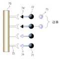 한편, 도 7에는 항체를 전극 표면에 직접 고정한 다음, 면역 반응에 의한 전기화학적 신호발생을 유도하는 개략적인 방법이 도시되어 있다.  도 7을 참조하면, 전극 (76) 표면에 2-머캅토에틸아민 등을 이용하여 아민기를 부여하고, 카르복실기를 갖는 항체 (73)를, 펩타이드 커플링 방법, 티올 커플링 방법, 흡착 등에 의해서 결합시킨다.  분석물 채취부로부터 유입된 검체 항원 (71) 및 표준 항원 (72)의 혼합물은, 각각 항체 (73)에 대한 결합 부위 (74 및 74')를 포함하고 있으므로, 항체 (73)에 경쟁적으로 결합하게 된다.  전기화학적 신호의 검출은 신호발생원 (75)이 결합된 표준 항원 (72)에 의해서 발생되며, 전기화학적 신호의 검출량이 클 경우, 상대적으로 분석물 중의 검체 항원 (71) 함량이 적다는 것을 의미하고, 반대로 전기화학적 신호의 검출량이 작을 경우, 상대적으로 분석물 중의 검체 항원 (71) 함 량이 많다는 것을 의미하게 된다.On the other hand, Figure 7 shows a schematic method of immobilizing the antibody directly on the electrode surface, and then inducing electrochemical signaling by the immune response. Referring to FIG. 7, an amine group is given to the surface of the