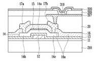 채널 영역(14a)의 반도체층(14) 상에는 확산 방지막(15)이 형성되고, 확산 방지막(15)과 반도체층(14)을 포함하는 상부에는 소스 및 드레인 영역(14b 및 14c)이 노출되도록 콘택홀이 형성된 층간 절연막(16)이 형성되며, 층간 절연막(16) 상에는 콘택홀을 통해 소스 및 드레인 영역(14b 및 14c)과 접촉되는 소스 및 드레인 전극(17a 및 17b)이 형성된다. 이 때 화소 영역(220)에는 소스 및 드레인 전극(17a 및 17b)과 연결되는 데이터 라인(226)이 형성되고, 비화소 영역(230)에는 화소 영역(220)의 데이터 라인(226)으로부터 연장되는 데이터 라인(226) 및 외부로부터 신호를 제공받기 위한 패드(228)가 형성될 수 있다. 확산 방지막(15)은 금속 이온을 함유하는 질화물 예를 들어, 티타늄 질화물(TiN) 등으로 형성될 수 있고, 절연막(16)은 수소(H) 이온(16a)을 함유하는 질화물 예를 들어, 실리콘 질화물(SiNx) 등으로 형성될 수 있으며, 소스 및 드레인 영역(14b 및 14c)에 수소 이온(16a)이 함유된다.The