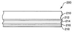 유기 전자 장치용 광 방사 물질을 함유하는 층들의 선택적 열 전이는 열 전이 증여체를 이용하여 수행될 수 있다.  도 2는 본 발명에 사용하기 적합한 열 전이 증여체(200)의 예를 보여준다.  증여체 요소(200)는 바닥 기질(210), 선택적 하부층(212), 선택적인 광-열 변환 층(LTHC 층)(214), 선택적인 사이층(216), 및 배향되었거나 배향이 가능한 방사성 물질 또는 기능성 정렬 층을 포함하는 전이 층(218)을 포함한다.  상기 요소들 각각은 이하에 더욱 상세히 기재한다.  다른 층들도 존재할 수 있다.  적절한 증여체 또는 증여체 층들의 예가 미국 특허 제 6,242,152 호; 6,228,555 호; 6,228,543 호; 6,221,553 호; 6,221,543 호; 6,214,520 호; 6,194,119 호; 6,114,088 호; 5,998,085 호; 5,725,989 호; 5,710,097 호; 5,695,907 호 및 5,693,446 호 및 함께 양도된 미국 특허출원 제 09/853,062 호; 09/844,695 호; 09/844,100 호; 09/662,980 호; 09/662,845 호; 09/473,114 호 및 09/451,984 호에 개시되어 있다.Selective thermal transfer of layers containing light emissive materials for organic electronic devices can be performed using a thermal transfer donor. 2 shows an example of a