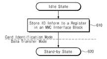 카드 확인 모드가 종료되면 멀티미디어카드(200) 내 제2 메모리 칩(240)은 데이터 전송 모드로 진입한다(620).  데이터 전송 모드 동안, 플래시 메모리(244)의 관리는 멀티미디어카드 컨트롤러(242)에 의해서 행해진다.When the card check mode ends, the