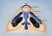융비술을 하기 위한 코의 해부를 살펴보면, 도 10에 도시한 바와 같이, 콧등(코천장)은 연골천장과 뼈천장으로 나눌 수 있다.Looking at the anatomy of the nose for the cartilage surgery, as shown in Figure 10, the nose, etc. (nasal ceiling) can be divided into cartilage ceiling and bone ceiling.