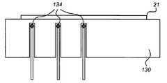도 3에서는 몇 개의 온도감지기(134)가 지시되고, 기판(21)에 인접한 노체(130)의 표면 가까이 정렬된다. 온도감지기들이 기판(21)에 인접한 노체(130)의 표면 가까이 정렬되는 것, 즉 5mm이하, 바람직하게는 대략 2mm이하의 거리만큼 떨어져 있는 것이 본 발명에서는 필수적이다. 그 결과, 노체로부터 열방출의 결과로서의 온도하강은 적당하게 검출될 것이다. 위에서, 참조는 항상 하나의 감지기로 만들어 졌으나 , 실제는 보통 노체가 전 표면위에 소망의 온도를 가지게 되는 것을 가능하게 하기 위해서 가열된 노체 위에 정렬되고 분배된 몇 개의 온도감지기가 필요할 것이다. 기판운반을 시작하기 위해 사용되는 온도신호는 노체의 표면의 근접한 것에 정렬된 감지기들로부터 기인하는 모든 온도신호들의 평균일 수 있다. 또한, 다양한 감지기들 사이의 온도차이들이 너무 높다면, 제어는 기판을 반입을 취소하는 방식으로 실행될 수 있다. 다르게는, 모든 감지기들이 결정된 값 이하만큼 소망의 온도(Ttrig)로부터 벗어나는 온도에 도달하게 하는 것을 그 조건으로 할 수 있다. 실제로 이것은 동일한 것으로 취급될 것이다. 유사한 측정은, 가열된 노체가  기판의 어느 한 면에 정렬될 때 적용될 것이며, 두 노체들은 하나 이상의 온도센서들이 부착된다.In FIG. 3