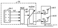 상기 라인(64)은 개별 안테나 트랜스듀서들(44)에 상기 업-믹싱된 신호를 인가하기 위한 개별 분기들을 포함한다. 가중 요소들(66 및 68)은 상기 라인(64)의 개별 분기들에 일렬로 배치된다. 즉, 상기 라인(64)의 분기는 상기 가중 요소(66)의 입력 단자에 연결되고, 상기 라인(64)의 제2 분기는 상기 가중 요소(68)의 입력 단자에 연결된다. 라인들(72 및 74)은 또한 각각 안테나 가중 요소들(66 및 68)에 연결된다. 상기 라인들(72 및 74)상에서 생성된 값들은 상기 업-믹싱된 신호들에 적용된 가중치들에 결정적이다. 일단 상기 신호들이 가중되면, 상기 신호들은 거기에서 변환될 안테나 트랜스듀서들에 인가된다. 부가적인 업-믹싱 및 다른 동작들은  상기 안테나 트랜스듀서들에의 인가 이전에 상기 가중된 신호들에 대해 수행된다.The