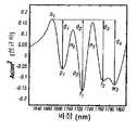 도 5는 본 발명에 따라 확인된 특징을 갖는 제1 상음에서 흡광 스펙트럼의 2차 도함수를 도시한 것이다.5 shows the second derivative of the absorbance spectrum at the first upper tone with the features identified in accordance with the invention.