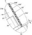 참조부호 34는 에어 모터(33)의 회전축(33C) 선단측에 장착된 회전 무화 헤드를 나타낸다.  상기 회전 무화 헤드(34)는, 예를 들면 금속 재료 또는 도전성 수지 재료로 형성되어 있다.  그리고, 회전 무화 헤드(34)는, 에어 모터(33)에 의해 고속 회전된 상태에서 후술하는 공급 튜브(44)를 통해서 도료를 공급함으로써, 상기 도료를 원심력에 의해 선단측의 방출 단부 에지(34A)로부터 분무한다.  또한, 회전 무화 헤드(34)에는 에어 모터(33) 등을 통하여 후술하는 고전압 발생기(45)가 접속되어 있다.  이로써, 정전 도장을 행하는 경우에, 회전 무화 헤드(34) 전체에 고전압을 인가할 수 있고, 이들 표면을 흐르는 도료를 직접적으로 고전압으로 대전시킬 수 있다.