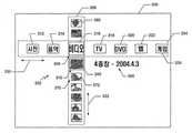 디스플레이 제어 장치(204)는 메뉴 관리기(242), 효과 프로세서(244), 컨텐츠 제어기(246), 및 이미지 생성기(248)를 포함한다. 메뉴 관리기(242)는 저장 장치(208) 및 데이터 I/O 장치(200)로부터 수신되어 메뉴 화면상에 나타난 미디어 아이템 및 멀티미디어 컨텐츠를 관리한다. 메뉴 관리기(242)는 또한 수신된 프로그램 정보에 기초하여 채널과 프로그램 리스트 및 엔트리를 구축하는 것을 포함하는 계층적 프로그램 가이드의 실행을 관리한다. 효과 프로세서(244)는 메뉴 화면에서 아이콘 및 아이콘 배열의 연산을 처리한다. 효과 프로세서(244)는 또한 메뉴 화면에 표시될 다양한 동작 및 결과를 관리한다. 컨텐츠 제어기(246)는 미디어 아이템 및 멀티미디어 컨텐츠의 처리 및 데이터 I/O 장치, 저장 장치(208) 및 게임 프로세서(206)로부터 데이터의 취급을 제어한다. 이미지 생성기(248)는 카테고리 아이콘 배열 및 컨텐츠 아이콘 배열을 포함하는 메뉴 화면 및 계층적 프로그램 가이드의 디스플레이를 생성하도록 작동한다.The display control device 204 includes a menu manager 242, an effects processor 244, a content controller 246, and an image generator 248. The menu manager 242 manages media items and multimedia contents received from the