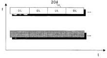도 2C는 전형적인 FDD 할당 과정이 발생하였으며, 적어도 하나의 반송파 주파수가 UL 방향에 대해, 다른 주파수가 DL 방향에 대해 예비되어 있는 추가적인 시나리오를 개시한다. 2개의 방향들은 과거에 활성(데이터 전송의 발생)이었거나 그 렇지 않을 수 있지만, 도 2C에 의해 시각화되는 시간 창 내에서, UL은 비활성이며, 이에 따라 어떤 진정한 페이로드 데이터 또는 시그널링이 이 방향으로 전송되지 않는다. 이후에, 만일 동일 주파수를 통한 UL/DL 전송들간의 간섭을 피하기 위해 필요한 보호 기간들이 적당하게 정의되어 있는 경우에, DL 수신에 관한 보고들 또는 일부 다른 보다 적은량의 데이터가 DL 대역에서 UL 방향으로 주기적으로 송신될 수 있으며(204), 통신 링크의 양 단들은 간헐적인 보고들을 인식하고 있다(예를 들어, 이전 DL 전송 유닛이 미래 타임 슬롯에서 송신될 보고를 요구하였을 수 있다).2C discloses an additional scenario in which a typical FDD allocation process has occurred and at least one carrier frequency is reserved for the UL direction and another frequency is reserved for the DL direction. The two directions may or may not have been active in the past (occurrence of data transmission), but within the time window visualized by FIG. 2C, the UL is inactive, so any true payload data or signaling is transmitted in this direction. It doesn't work. Later, if the guard periods necessary to avoid interference between UL / DL transmissions on the same frequency are properly defined, reports on DL reception or some other lesser amount of data may be sent from the DL band to the UL direction. It may be sent 204 periodically, and both ends of the communication link are aware of intermittent reports (eg, a previous DL transmission unit may have requested a report to be sent in a future time slot).