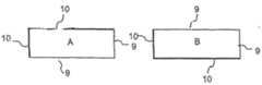 도 4a 및 도 4b는 본 발명에 따른 제 1 형태(A)와 제 2 형태(B)인 두 가지 형태의 직사각형 마루판을 도시한 도면이며, 본 실시예에서는 그 장측면(4a, 4b)의 길이가 단측면(5a, 5b)의 길이의 3배이다.  상기 마루판은 소위 "연결수단"이라 불리는 제 1의 수직 및 수평 잠금 수단 쌍을 가지며, 이는 제 2의 수직 및 수평 잠금 수단 쌍과 상호 작용한다.  상기 두 가지 형태는, 상기 잠금 수단의 위치가 거울 역상 것을 제외하고, 본 실시예에서 동일하다.  상기 잠금 수단(9, 10)은, 제 1 잠금 수단 쌍(9)이 제 2 잠금 수단 쌍과 연결될 때, 단측면 대 장측면의 연결을 가능하게 한다.  본 실시예에서, 연결은, 스냅핑-인과 내측 굽힘 모두에 의해서, 그러나 연결 가장자리를 따르는 삽입에 의해서도, 이루어질 수 있다.  수많은 변형이 사용될 수 있다.  상기 마루판의 두 가지 형태가 동일한 형식일 필요는 없으며, 전술한 바와 같이, 단측면에 대하여 장측면이 연결될 수 있다면, 상기 잠금 수단도 서로 상이한 형상일 수 있다.  상기 연결수단은 동일한 물질 또는 서로 다른 물질로 제조될 수 있으며, 또는 동일한 물질이지만 서로 상이한 특성을 가진 물질로 제조될 수 있다.  예를 들어, 상기 연결수단은 플라스틱 또는 금속으로 제조될 수 있다.  상기 연결수단은 마루판과 동일한 물질로 제조될 수도 있으나, 함침(impregnation) 등과 같이 특성변경처리될 수 있다.4A and 4B show two types of rectangular floorboards of the first form (A) and the second form (B) according to the invention, in this embodiment the lengths of their