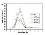 촉매의 평균 결정입자의 크기는 (101)결정면을 이용하여 Scherrer’s equation로 계산을 하여 얻을 수 있다. 그 결과는 또한 표 1에 나타내었다. 표 1에 의하면 평균 결정입자의 크기는 도핑된 TiO2가 순수 TiO2 (14.05 nm) 보다 적게 나옴을 알 수 있다.[S-TiO2: 11.33 nm 그리고xZr,S-TiO2: 10.78~7.99 nm]xZr,S-TiO2 시리즈를 볼 때, Zr의 양이 증가함에 따라 평균 결정입자의 크기는 작아짐을 알 수 있는 데, 이것은 졸-겔 합성이 이루어지는 과정에서 Zr 또는 S이 Ti4+을 치환함에 따라 결정의 성장을 막아서 생긴 현상이라 할 수 있다. 이 현상은 앞에서 언급한 격자상수 계산결과와 상응하는 결과라 할 수 있다.The average grain size of the catalyst can be obtained by calculating the Scherrer's equation using the (101) crystal plane. The results are also shown in Table 1. According to Table 1, the average crystal grain size shows that the doped TiO2 is smaller than the pure TiO2 (14.05 nm). [S-TiO2 : 11.33 nm andx Zr, S-TiO2 : 10.78 ~ 7.99 nm]x Zr, S-TiO2 series, it can be seen that the average grain size decreases as the amount of Zr increases, which means that Zr or S is Ti4+ in the process of sol-gel synthesis. It can be said to be a phenomenon caused by preventing the growth of crystals by replacing. This phenomenon can be said to be the result corresponding to the aforementioned lattice constant calculation result.