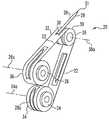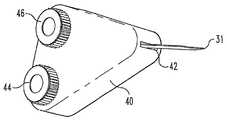 바람직한 형태에서, 랜싱 개구를 통한 팁 (31) 의 이동은 일반적으로 랜싯의 종방향 길이를 규정하는 선을 따라 이루어지는 재빠른 후진 및 전진 거동이다.     이는 랜싱 거동으로 지칭된다.     노브 (44, 46) 는, 테이프 (22) 를 그 경로를 따라 재빨리 후진 및 전진 이동시킴으로써 이러한 재빠른 랜싱 거동을 제공하기 위해, 클러치 및 적절한 스프링 바이어싱 (spring biasing) 을 포함하도록 각각 구성될 수 있다.     테이프 경로를 따른 테이프 (22) 의 후진 및 전진 이동에 의한 후진 및 전진 랜싱 거동을 얻기 위한 다른 방법으로서, 장치 (20) 전체가 후진 및 전진 이동으로 병진하도록, 장치 (20) 전체가 하우징 (40) 내에 설치될 수 있다.     또다른 실시형태에서, 랜싱 동안 단지 테이프 (22) 의 일부만이 이동된다.     단지 테이프 (22) 의 일부만의 상대적인 이동을 통해 랜싱 거동을 제공하는 실시형태가 도 3 에 도시되어 있다.In a preferred form, the movement of the