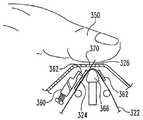도 9 를 참조하여 보면, 상기한 릴-대-릴 방식 (reel-to-reel manner) 의 또 는 다른 적절한 방식의 테이프의 굽힘부에 인접하게 랜싯 (328) 을 위치시키도록 테이프 (322) 가 공급된다.     그리고 나서, 핀 (362) 을 갖는 액티베이터 (activator, 360) 가 랜싯 (328) 상에서 대응 슬롯과 결합하여, 랜싯을 무균 커버 (332) 로부터 꺼내고 팁 (331) 을 보유 재료의 전방 개구 (342) 내로 가져온다.     팁이 보유 물질에 의해 더 이상 구속되지 않으면, 랜싯 (328) 의 팁 (331) 은 도 9 에 도시된 것처럼 활성화 위치로 자유롭게 연장될 수 있다.     그러면, 액티베이터 (360) 는 후진 및 전진 랜싱 이동으로 랜싯 (328) 을 전진 및 후퇴시켜, 인접한 조직 (350) (이 예에서는 손가락 끝으로 도시되어 있음) 을 랜싱한다.     그리고 나서, 액티베이터 (360) 는 랜싯 (328) 을 해제시키고, 적어도 부분적으로 보유 재료 (326) 아래에 두며, 테이프와 사용된 랜싯 (328) 은 전진하여 저장된다.     이처럼 테이프가 전진하면, 테스트 미디어 (362) 가 조직 (350) 으로부터 테스트 미디어 (362) 로의 체액의 직접 운반 및 그 다음에 이루어지는 광학 리더 (366) 에 의한 분석을 위한 개구에 인접하게 위치된다.With reference to FIG. 9, the