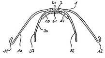 본 발명에 따른 성장안내장치(GGA)의 요부들을 도 1의 바람직한 실시예에 도시한다.  뺨에 대략 평행한 안면의 외측면에서 연장되는 외측활부(10)를 갖는 기본적으로 공지된 안면활부(1)는 전이부(20)의 내측활부(30)에 견고하게 연결된다.  외측활부(10)의 양단부에는, 도 1에는 도시하지 않은 머리 및 목 인장스트립에 직접 또는 공지의 안전모듈을 통해 착탈 가능하게 연결될 수 있는 후크(11, 12)를 포함한다.  전이부(20)의 외측활부(10)에 작용하는 장력은 구강 내에 위치하는 내측활부(20)에 전달된다.  상기 외측활부(10), 내측활부(30) 및 전이부(20)는, 전이부(20)가 치료대상자의 입술의 틈 사이에 위치하여, 안면활부(1)의 착용시에 자유롭게 입술을 닫을 수 있도록 설계된다.  내측활부(30)는 외측활부로부터 전달된 장력을 직접 치아로 전달하거나 이하에 상세히 설명하지 않는 공지의 착탈형 플레이트기기에 전달된다.  안면활부(1)의 적용시, 내측활부(30)의 근접단부(31, 32)는 어금니나 또는 플레이트상의 적절한 수용체 상에 위치하는 근접단부용 관속으로 밀어 넣어진다.  측면도에서 볼 수 있는 탄성루프(36, 37)는 안면활부(1)를 수평상태로 위치시키는 역할을 한다.  안면활부(1)는 입 주위 패드홀더(3)를 수용하고 착탈 가능하게 고정시키는 수용체(2)에 의해 전이부(20)에 마련된다.  도 1에서 수용체(2)는 전이부(20)의 내측 중앙에 배치됨을 알 수 있다.  이 수용체는 바람직하게는 전 이부와 용접되며, 그 속에 지지된 패드홀더(3)의 기울어짐 또는 피봇동작을 방지하기 위해 적절한 수직연장부를 갖는다.  도시한 실시예에 있어서, 수용체(2)는 Y형상의 패드홀더(3)의 착탈식 고정을 위한 중앙고정나사를 구비한 사각형 슬리브형상으로 형성된다.The main parts of the growth guidance device (GGA) according to the invention are shown in the preferred embodiment of FIG. A basically known face bow 1 having an