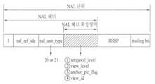 NAL 단위는 기본적으로 NAL헤더와 RBSP의 두 부분으로 구성된다. NAL헤더에는 그 NAL 단위의 참조픽처가 되는 슬라이스가 포함되어 있는지 여부를 나타내는 플래그 정보(nal_ref_idc)와 NAL 단위의 종류를 나타내는 식별자(nal_unit_type)가 포함되어 있다. 그리고, 시점 확장성(view scalability)을 제공하기 위한 계층적인 구조에 대한 정보를 나타내는 레벨 정보(view_level)도 포함할 수 있다.The NAL unit basically consists of two parts: the NAL header and the RBSP. The NAL header includes flag information (nal_ref_idc) indicating whether a slice serving as a reference picture of the NAL unit is included and an identifier (nal_unit_type) indicating the type of the NAL unit. And, it may also include level information (view_level) indicating information on a hierarchical structure for providing view scalability.