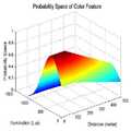 색상 특징에 대해 생성된 실험적 확률분포에 대해 설명한다. 색상 특징은 텍스쳐와 무관하고 거리 및 조도 변화에만 영향을 받는다. 대상 물체와 유사한 색상이 없는 경우, 거리 변화에 대해 색상 특징은 강인하다. 그리고 이 특징의 정확도는 조도 변화에서 가우시안 분포를 나타낸다. 도 9에 실험결과에 의한 색상 특징의 특성을 나타내었다.The experimental probability distribution generated for the color features is described. Color features are independent of texture and are only affected by distance and light intensity variations. If there is no color similar to the object, the color feature is robust against distance changes. And the accuracy of this feature represents a Gaussian distribution in the change in illuminance. 9 shows the characteristics of the color features according to the experimental results.
