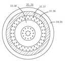 먼저, 도 11에 도시된 바와 같이, 복수개의 용량 결합 전극(31, 33, 36, 38)을 구성하는 복수개의 정전압 전극(33, 38)과 복수개의 부전압 전극(31, 36)은 상호 교대적으로 배열되고 그 사이에는 복수개의 가스 분사홀(32, 37)이 배열될 수 있다.  도 12 또는 도 13과 같이, 복수개의 정전압 전극(33, 38)과 부전압 전극(31, 36)은 일정 길이로 나뉜 구조에서 같은 전극이 동일 열(또는 행)로 배열되되 상호 교대적으로 배열된 구조(도 12) 또는 매트릭스형으로 배열된 구조(도 13)를 가질 수 있다.  도 14 또는 도 15에 도시된 바와 같이, 복수개의 용량 결합 전 극(31, 33, 36, 38)은 복수개의 사각 또는 원형의 평판형 면적극으로 구성될 수 있다.  도 16에 도시된 바와 같이, 복수개의 용량 결합 전극(31, 33, 36, 38)은 원기둥과 같은 기둥 구조를 가질 수도 있다.  도 17 내지 도 21에 도시된 바와 같이, 복수개의 용량 결합 전극(31, 33, 36, 38)은 상호 교대적으로 배열된 평판 나선형 구조나 동심원 구조를 가질 수 있다.  이러한 구조에서 복수개의 용량 결합 전극(31, 33, 36, 38)은 단지 하나의 정전압 전극(33, 38)과 부전압 전극(31, 36)으로 구성될 수도 있다.First, as shown in FIG. 11, the plurality of