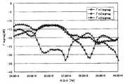 도 9에 벡터 측정기로 측정한 38㎓에 있어서의 3개의 방향성 오차의 관계값(EDFl,EDF2,EDF3)을 나타낸다. 도 10에 방향성 오차가 다른 3개의 경우에 있어서의 DUT 스칼라 측정값을 나타낸다. 도 11, 도 12는 도 9, 도 10의 측정값을 수학식 8, 수학식 9에 대입하여 계산한 후의 DUT의 측정값(진폭)과 벡터 측정값을 나타낸다. 도 12에서는 3개의 스칼라 측정값으로부터 위상 정보를 포함한 벡터 측정값이 얻어져 있는 것이 나타나 있다.Fig. 9 shows relationship values EDF1 , EDF2 , and EDF3 of three directional errors at 38 kHz measured by a vector measuring instrument. 10 shows the DUT scalar measurement values in three cases in which the directional errors are different. 11 and 12 show measured values (amplitudes) and vector measured values of the DUT after substituting the measured values shown in FIGS. 9 and 10 into equations (8) and (9). 12 shows that the vector measured value including the phase information is obtained from the three scalar measured values.