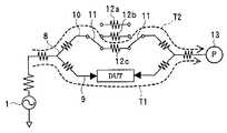 도 7은 도 1에 나타내는 반사 측정계와 도 6의 전달 측정계를 조합한 1패스 2포트 측정 시스템의 예를 나타낸다. 신호원(1)이 발생한 측정 신호는 파워 스플리터(8)에 의해 분기되고, 한쪽의 측정 신호는 DUT에 인가되며, 다른 쪽의 측정 신호는 누설 전환 스위치(11)를 통하여 3개의 누설 오차(12a~12c)의 어느 하나에 인가된다. DUT의 투과파와 누설 오차(12a~12c)의 투과파의 중첩 신호는 전력 측정기(13)에 의해 전력값(스칼라값)으로서 측정된다. DUT를 접속한 신호 경로(2)의 도중에는 커플러(3)가 마련되고, 커플러(3)에 의해 신호 경로(2)와 결합된 다른 신호 경로의 신호원측의 포트에는, 반사파의 전력값으로서 측정하는 전력 측정기(5)가 접속되며, DUT측의 포트에는 방향성 전환 스위치(6)를 통하여 3개의 방향성 오차(7a~7c)가 접속되어 있다. 방향성 전환 스위치(6)를 3위치로 전환하면서 전력 측정기(5)에 의해 전력값을 측정하고, 누설 전환 스위치(11)를 3위치로 전환하면서 전력 측정기(13)에 의해 전력값을 측정한다. 이들 측정값으로부터 수학식 8, 9 및  수학식 10, 11을 이용하여 DUT의 반사 계수(ΓT) 및 전달 계수(TT)를 구할 수 있다.FIG. 7 shows an example of a one-pass two-port measurement system in which the reflection measurement system shown in FIG. 1 and the transmission measurement system of FIG. 6 are combined. The measurement signal generated by the