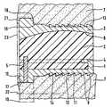 도2 및 도3에 도시된 제1 실시예에서, 커버 플레이트(1, 3)는 배쪽 모서리에서 톱니를 보유하는 표면을 넘어 위쪽 방향 또는 아래쪽 방향으로 돌출하는 리지형 돌출부(15)를 구비한다.  돌출부가 도3에서 알 수 있는 바와 같이 낮은 높이만을 갖지만, 돌출부는 그의 대체로 평평하게 연장되는 형태 때문에 플랜지로서 불린다.  이러한 플랜지는 삽입 시에, 그의 등쪽을 향한 멈춤 표면(16)이 관련 추골(7)의 배쪽 제한 표면(17) 전방에 놓이도록 위치될 수 있다.  그러나, 해부학적 상태에 따라 보철물 부품이 인접한 추골의 기준면(23)을 넘어 배쪽으로 돌출하여 거기서 식도 또는 다른 장기의 자극을 일으키는 것이 그러한 배열과 관련될 수 있기 때문에, (도3에 도시된 바와 같은) 플랜지(15)가 뼈 속으로 들어가는 수술 기술이 양호하다.  바꾸어 말하면, 소량의 재료가 플랜지(15)에 대응하는 형상 및 크기를 가지며 삽입 후에 플랜지를 수납하는 리세스가 생성되도록 추골의 배쪽 가장자리에서 제거된다.  그 다음 플랜지의 멈춤 표면(16)은 이러한 리세스의 배쪽 단부면에 대해 놓인다.  이러한 단부면 상에서의 멈춤 표면(16)의 타이트한 맞닿음을 가능케 하기 위해, 플랜지의 모서리(18)는 라운딩될 수 있다.  뼈가 너무 많이 약해지지 않도록, 이는 플랜지가 톱니를 보유하는 표면 위에서 낮은 높이만을 갖는 것을 요구한다.  이러한 높이는 0.5 내지 2 mm 정도, 양호하게는 0.8 내지 1.3 mm 사이이어야 한다.  전후 방향(AP 방향)으로의 삽입물의 최대 치수의 분율로 표현하면, 이는 양호하게는 1/20 내지 2/10이다.In the first embodiment shown in Figs. 2 and 3, the