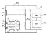 제어 유닛(7)의 비용 절감을 달성하기 위한 관점에서, 도 10에 나타낸 바와 같이, 전자기 결합부(X)와 광 결합부(Y)는 기능 유닛(4)의 일측에만 제공될 수 있다.  제어 프로그램의 재기록 또는 갱신 동작은 개인용 컴퓨터를 사용하여 정보선(L2)을 통해 수행될 수 있다.  또, 도 11에 나타낸 바와 같이, 제어 유닛(7)은 드라이브 디바이스(103)를 가질 수 있으며, 드라이브 디바이스(103)에는 기능 유닛용의 제어 프로그램을 가지는 CD, DVD 디스크, 또는 SD 메모리와 같은 저장 매체(110)가 탈착 가능하게 삽입된다.  또, 도 12에 나타낸 바와 같이, 제어 유닛(7)은 CPU(104)와 메모리(102)로 간편하게 구성될 수 있다.  이 경우에, 제어 유닛(7)은, 제어 유닛(7)과 베이스 유닛(3) 또는 기능 유닛(4) 사이의 접속에 사용되는, 전자기 결합부(X)와 광 결합부(Y)를 가지는 어댑터(105)에 탈착 가능하게 접속될 수 있다.In view of achieving a cost reduction of the