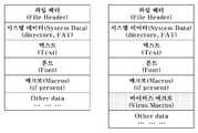 도 2a를 참조하면, 매크로 바이러스의 경우를 나타낸 것으로 MS 워드(Word)나 엑셀(Excel) 등과 같이 문서 파일에서 매크로가 들어가는 부분에 바이러스 매크로(Macros Virus)가 삽입되는 경우이다.Referring to FIG. 2A, a macro virus is illustrated and a virus macro is inserted into a portion of a document file in which a macro is inserted, such as MS Word or Excel.