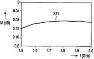 도 7은 신호의 크기 M이 주파수 f의 함수로서 설정된 다른 그래프를 도시한다.   이 그래프의 대상은 제 1 실시예의 커플러(10)이다.    이 그래프는 삽입 손실 신호로서 알려진 신호 출력부(21)에서의 신호 S21를 도시한다.   1.5 GHz 와 2 GHz 간의 영역에서 이 삽입 손실 정도는 -0.12 및 -0.08 dB이며 이는 매우 작은 값이다.7 shows another graph in which the magnitude M of a signal is set as a function of frequency f. The object of this graph is the