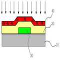 1) 단계에서는, 스퍼터링법으로 유리 기판(10) 상에 인듐주석산화막(ITO)을 증착한 후, 포토리소그래피법을 사용하여패터닝하여 복수의 게이트 배선과 게이트 전극(20)을 형성하였다.In step 1), an indium tin oxide film (ITO) is deposited on the