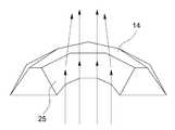 내측면(25)은 전방, 즉 광원(11)이 위치한 측면 방향에 대해 경사지게 누워 있는 형태를 가지도록 구성된다. 도 3b의 말굽형상의 반사패턴의 단면을 참조하여 설명하면, 내측면(25)은 도 3b의 반사패턴(14)의 내측 밑각인 내측 밑각(α)만큼 경사도를 유지하면서 전방을 향하여 오목한 형상을 갖도록 형성된다. 상기 내측면(25)은 도 3c에서 보이는 바와 같이 폭(W)과 높이(H)에 의해 결정되는 곡률을 갖는 곡면 또는 도 4b에서와 같이 부분적 평면의 연속으로 형성될 수 있다. 이렇게 형성된 내측면(25)은 도 4에서와 같이 도광판(13) 내에서 전반사 중이거나 산란 중인 광을 집광하여 도광판(13)의 상측으로 방출한다.  다시 말하면, 내측면(25)은 광을 집광 및 확산하는 기능을 수행하여 좌우 시야각을 향상시킨다.The
