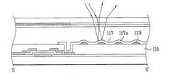 종래 기술에 의한 반사전극은 기존의 편평한 구조가 아니라, 도 4d에서와 같이, 반사전극(117)에 반사요철(117a)을 주어 국부적으로 반사각을 변화시켜서 정면의 반사광량을 확보하는 것이다.The reflective electrode according to the prior art is not a conventional flat structure, but as shown in FIG. 4D, the