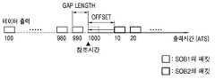 도 3을 참조하면, 첫 번째 데이터 스트림인 SOB1에는 도착 시간 정보 값이 "100"에서부터 "990"까지 기록되어 있고, 두 번째 데이터 스트림인 SOB2에는 도착 시간 정보 값이 "0"에서부터 기록되어 있다. 이는 기록 장치의 ATS 생성기가 SOB1을 기록할 때 처음 도착한 패킷 데이터의 ATS 값인 "100"으로 카운터를 초기화하여 기록하고, SOB2를 기록할 때는 SOB1과는 상관없이 다시 처음 도착하는 패킷 데이터의 ATS 값인 "0"으로 초기화하여 기록했음을 의미한다. 이와 같이 독립적인 ATS값을 가지는 두 개의 데이터 스트림을 연속으로 재생하는 경우, 카운터의 값과 SOB1의 ATS 값을 비교하면서 SOB1을 재생하고, SOB1의 재생이 종료된 후 다시 카운터를 "0"으로 초기화시키고 SOB2를 재생하게 된다. 그러나, 종래의 재생 장치에는 SOB1의 재생을 종료한 후 SOB2를 재생할 때까지 얼마만큼의 시간 간격을 두어야 하는지 등에 대한 동작이 정의되어 있지 않다. 따라서, 카운터가 SOB2의 첫 번째 패킷 데이터에 부가된 ATS인 "0"으로 초기화되는데 약간의 멈춤이 발생한다.Referring to FIG. 3, arrival time information values are recorded from "100" to "990" in the first data stream SOB1, and arrival time information values are recorded from "0" in SOB2, the second data stream. When the ATS generator of the recording device records SOB1, it initializes and records the counter as "100", which is the ATS value of the packet data first arrived. 0 "means initialized and recorded. When two data streams having independent ATS values are continuously played in this way, the SOB1 is played while comparing the counter value with the ATS value of SOB1, and after the SOB1 playback is finished, the counter is reset to "0" again. And regenerate SOB2. However, in the conventional reproducing apparatus, an operation is not defined for how much time intervals to leave after reproducing the SOB1 and reproducing the SOB2. Thus, some stop occurs when the counter is initialized to "0", which is the ATS added to the first packet data of SOB2.