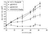 도 13은 A431 세포주를 이용한 인간의 피부 편평세포암종(epidermoid carcinoma)의 마우스 이종이식(xenograft) 모델에 처리된 항 Ang-2 단클론 항체 클론 3.19.3의 항암효과를 보여주는 선그래프이다. x 축은 암세포 이식후의 경과일 수를 나타내고, y 축은 cm3로 표시된 암의 평균부피 +/- SEM을 나타낸다. (▲)은 항 Ang-2 단클론 항체 클론 3.19.3이 주사된 마우스의 이식후 암부피의 측정값을 나타내고, (●)은 동형 대조군 항체인 PK16.3.l이 주사된 마우스의 이식후 암부피의 측정값을 나타낸다.FIG. 13 is a line graph showing the anticancer effect of anti-ang-2 monoclonal antibody clone 3.19.3 treated in a mouse xenograft model of human skin epidermoid carcinoma using A431 cell line. The x axis represents the number of days after cancer cell transplantation and the y axis represents the mean volume +/- SEM of the cancer, expressed in cm3. (▲) shows the measurement of cancer volume after transplantation of mice injected with the anti Ang-2 monoclonal antibody clone 3.19.3, and (●) the post-transplantation cancer of mice injected with the homologous control antibody PK16.3.l. The measured value of the volume is shown.