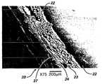 도 5는 직물(20)의 상부 표면(24)의 도면이다.  상부 표면(24)은 편직 패턴이 여전히 식별될 수 있지만, 섬유(23)의 대부분을 감싸면서, 도 4에 제시된 상처  접촉면과 마주보는 바와 같이 높은 농도의 Na-CMC 피복 물질을 함유한다.  도 3에 또한 제시된 바와 같이, 피복물은 모든 섬유를 메꾸고, 그 자신의 완전한 층(27)을 생성하기에 충분히 두껍다.  피복물에서 균열(29)로서, 약해보이는 이 층이 관찰된다.  피복물 층 두께는 어떤 부분에서는 약 3 ㎛ 내지 다른 부분에서는 약 30 내지 65 ㎛만큼 얇게 변한다.5 is a view of the