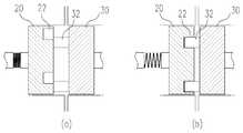 이처럼 돌기(32)에 의해 제1 휠(20)이 함입된 상태에서, 제1 구동휠(30)을 좌우로 회전시키면, 어디에선가는 돌기(32)가 홈(22)에 삽입되는 경우가 발생하며, 이에 따라 돌기(32)가 제1 휠(20)을 가압하는 상태가 해제되게 된다. 이처럼, 돌기(32)에 의한 외력이 제거됨에 따라, 도 2b의 (b)에 도시된 것처럼, 제1 휠(20)은 탄성력에 의해 원래의 위치로 복귀하게 되며, 이로써 제1 휠(20)이 제1 구동휠(30)에 정합된다.As such, when the