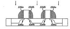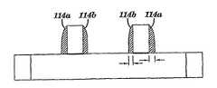 도 6에 도시된 바와 같이, 균일하지 않은 제2 스페이서 층(132) (예컨대, Si3N4)이 장치상에 형성된다. 도 1의 실시예와 유사하게, (게이트 사이의 거리가 충분히 가깝게 주어지고, 공정 조건이 적당히 조절된) 제2 스페이서 층(132)은 게이트 사이의 영역에서는 얇게 형성되고, 게이트 바깥 영역에서는 두껍게 형성될 것이다. 일단 제2 스페이서 층(132)이 도 7에 도시된 것처럼 패터닝되고 에칭되면, 비대칭 스페이서(124a, 124b)가 형성된다. 부차적으로 설명하면, 도 7에 도시된 공정 단계에 따라 형성된 장치의 예시적 SEM 이미지가 도 8에 도시되어 있다.As shown in FIG. 6, a non-uniform second spacer layer 132 (eg, Si3 N4 ) is formed on the device. Similar to the embodiment of FIG. 1, the second spacer layer 132 (given a sufficiently close distance between the gates and appropriately controlled process conditions) is formed thin in the region between the gates and thick in the region outside the gate. Will be. Once the