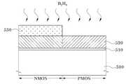 다음에, 포토레지스트 패턴(530)을 마스크로 하여 PMOS 영역의 폴리실리콘막을 P형 도펀트로 도핑시킨다. 구체적으로, 폴리실리콘막(520) 및 포토레지스트 패턴(530)이 형성된 반도체기판을 원자층증착(ALD) 챔버 또는 화학기상증착(CVD) 챔버로 로딩한 다음, 보론(B)을 함유하는 가스, 예를 들어 B2H6 가스를 챔버 내부로 주입하여 PMOS 영역의 폴리실리콘막(520)을 소킹(soaking)한다. 이때, ALD 또는 CVD 챔버의 온도는 50 ∼ 450℃ 정도, 소킹시간은 10 ∼ 180초 정도, 그리고 B2H6 가스의 유량은 50 ∼ 400sccm 정도로 한다.Next, the polysilicon film in the PMOS region is doped with a P-type dopant using the