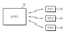 도 1은 일반적인 비접촉식 카드와 리더기(예를 들어, 버스카드 단말기, 지하철 단말기, 충전 단말기 등)간의 통신을 보여주는 블록도이다. 만약 리더기(10)의 인식거리 내에 1 개 이상의 비접촉식 카드(20, 30, 40)가 동시에 접근하면, 리더기(10)는 비접촉식 카드(20, 30, 40)에서 동시에 출력되는 신호로 인하여 데이터 통신의 혼선이 발생하게 된다. 이를 방지하기 위하여 리더기(10)와 비접촉식 카드(20, 30, 40)간에는 리더기(10)로 접근된 카드들(20, 30, 40)을 식별할 수 있는 통신충돌방지(Anticollision) 방식이 사용된다.1 is a block diagram illustrating communication between a general contactless card and a reader (eg, a bus card terminal, a subway terminal, a charging terminal, etc.). If more than one contactless card (20, 30, 40) near the recognition distance of the